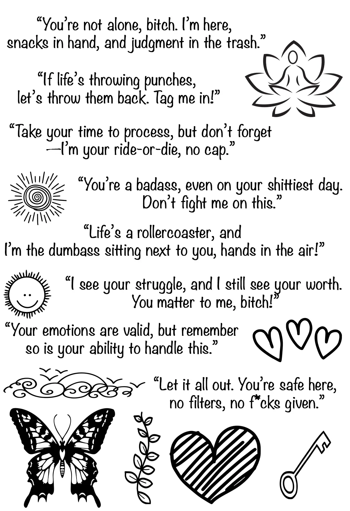 •Empowering Phrases: Includes heartfelt and humorous quotes like “You’re not alone, bitch. I’m here, snacks in hand, and judgment in the trash” and “Take your time to process, but don’t forget—I’m your ride-or-die, no cap.”